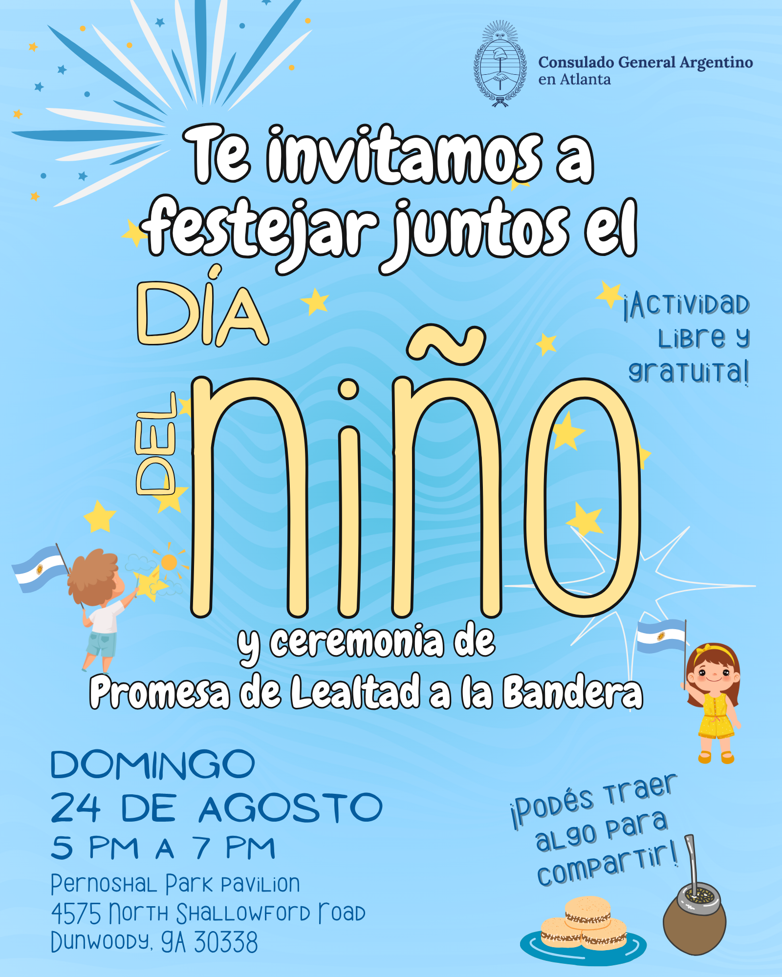 El Consulado General de la República Argentina en Atlanta invita a toda la comunidad a participar de una tarde especial el domingo 24 de agosto en el Pernoshal Park Pavilion (4575 N Shallowford Rd, Dunwoody, GA 30338).